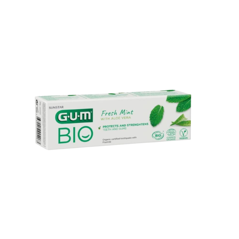 GUM Daily Protection Toothpaste Bio GUM Fresh Mint Organic cosmetics 75 ml Gentle formulation with 99% ingredients of natural origin, and 22% ingredients from organic farming: Aloe vera and peppermint Contains sodium fluoride (1450 ppm) to promote the prevention of caries and remineralises enamel Helps soothe gums after brushing with Aloe Vera Naturally fresh with its mint aroma Certified organic and vegan Free from dyes, gluten and lactose free.